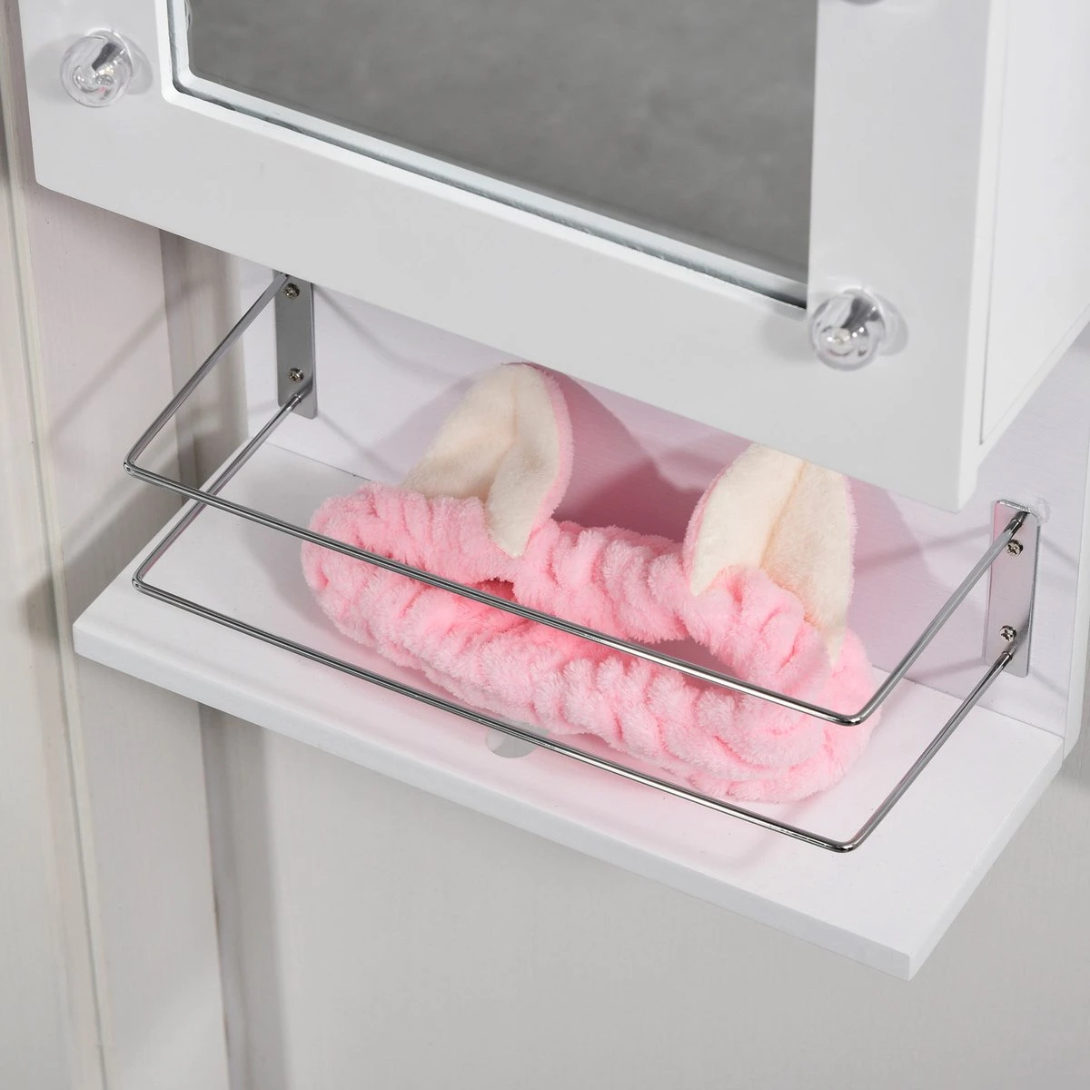 Deze vrijhangende juwelenkast is ideaal voor iedereen die op een elegante manier ruimte wil besparen in huis. Het frame is gemaakt van MDF, waardoor het duurzaam en betrouwbaar is voor dagelijks gebruik. Het is afgewerkt in een lichte tint wit om het er eenvoudig en mooi uit te laten zien. Rond de voorspiegel zorgen 18 retrolampen voor zachte verlichting die wordt aangestuurd door een schakelaar op de accubak.
