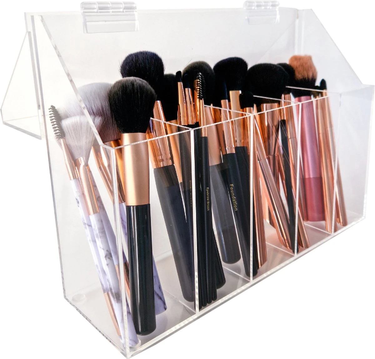 Met de kwasten houder verberg je en bescherm je de make up kwasten.