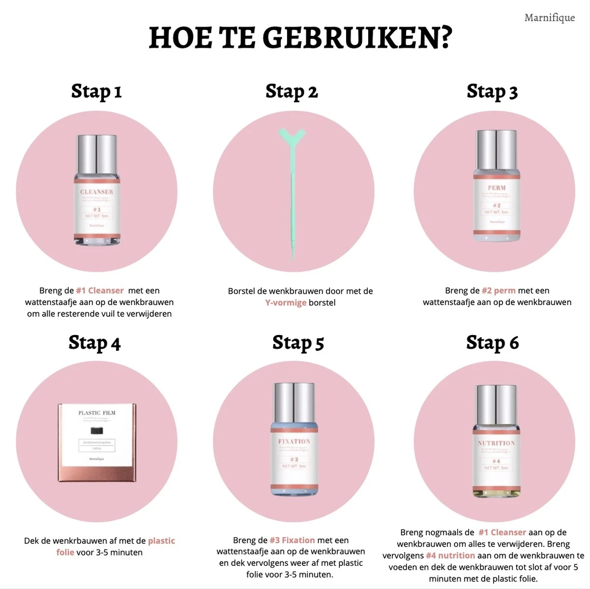 *Bij een gevoelige huid wordt er aangeraden om de producten eerst op de arm te testen om een (allergische) reactie te voorkomen op het gezicht/de wenkbrauwen. Geschikt voor ongeveer 5 tot 10 keer gebruik, afhankelijk van de wenkbrauwharen en eigen hoeveelheid gebruik van de producten.