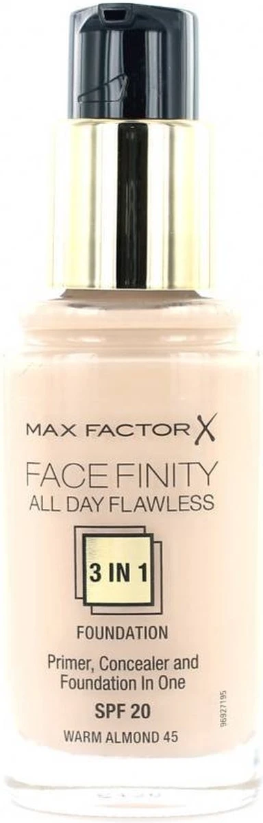 De Max Factor Facefinity All Day Flawless 3-in-1 Foundation is een vloeibare foundation, primer en concealer in één voor een langhoudende en matte finish. De foundation bevat een water-in-siliconen emulsie die makkelijk opbouwbaar is en zorgt voor een medium tot hoge dekking. Dankzij de primer blijft de make up foundation de hele dag zitten en dankzij de concealer worden oneffenheden en imperfecties perfect verhult. Dankzij de lichtgewicht formule voelt de 3-in-1 foundation licht aan. De foundation blijft ook zitten als je een mondkapje draagt!